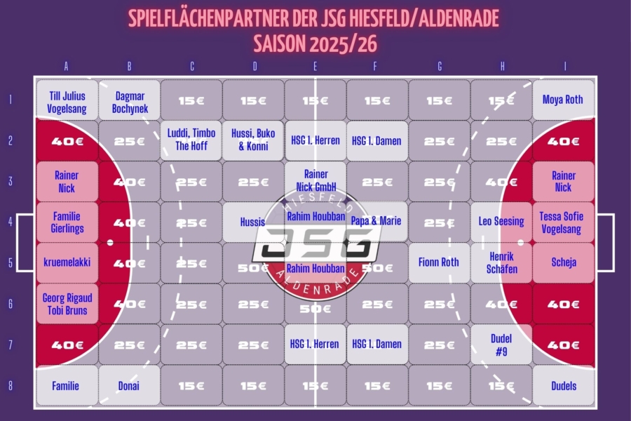 Unser Spielfeld ist in mehrere Felder unterteilt, die für einen gewünschten Betrag symbolisch erworben werden können. Als Käufer eines dieser Felder werden Sie nicht nur auf unserer Homepage verewigt, sondern auch in der Halle dargestellt.